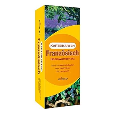 Die Karteikarten Basiswortschatz Französisch beinhalten mehr als 1500 Wörter auf über 500 Karteikarten. Die Karteikarten sind sowohl alphabetisch nach Kartennummer als auch thematisch nach Sachgruppe sortierbar. Beispielsätze zu jedem Wort sowie die Lautschrift, die angibt wie ein Wort ausgesprochen wird, beugen Verständnisschwierigkeiten vor und garantieren so Ihren optimalen Lernerfolg.Zubehör=500 Seiten. Verlag=ademo GmbH; Auflage: 1 (1. Juli 2006). Sprache=Deutsch, Französisch. ISBN-10=3867151016. ISBN-13=978-3867151016. Verpackungsabmessungen=21,6 x 8,6 x 6,2 cm. Durchschnittliche Kundenbewertung=4.0 von 5 Sternen 20 Kundenrezensionen. Amazon Bestseller-RangWortschatz & GrundwissenFranzösischSprachen lernen=Nr. 30.728 in Bücher (Siehe Top 100 in Bücher) .zg_hrsr { margin: 0; padding: 0; list-style-type: none; } .zg_hrsr_item { margin: 0 0 0 10px; } .zg_hrsr_rank { display: inline-block; width: 80px; text-align: right; } Nr. 18 in Bücher > Lernen & Nachschlagen > Fremdsprachen & Sprachkurse > Sprachkurse nach Sprachen > Französisch > Nr. 21 in Bücher > Lernen & Nachschlagen > Lernhilfen > Nr. 502 in Bücher > Kinderbücher >.
